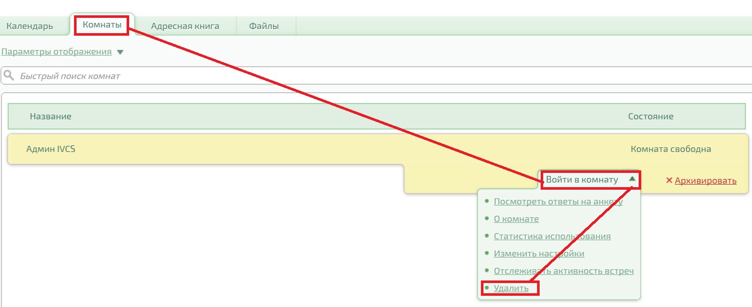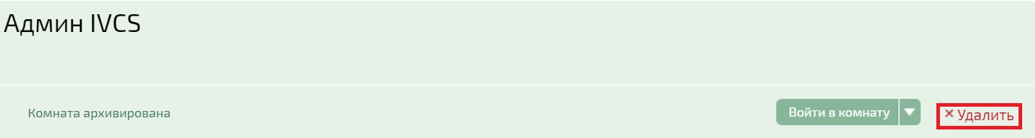 Для удаления неактивной комнаты или архивированной комнаты перейдите к списку комнат на вкладке «Комнаты», выберите вкладку «Показать архив комнат». Выберите интересующую комнату в архиве и нажмите на ссылку «Удалить» на карточке данной комнаты.