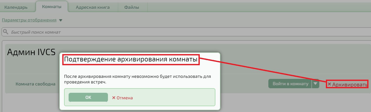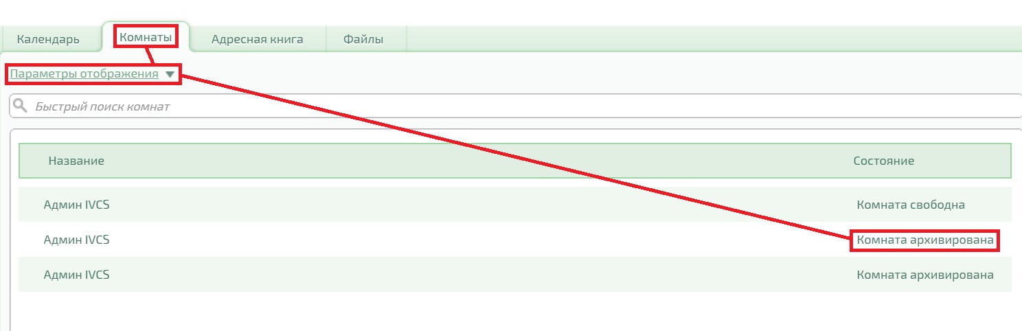 После архивирования комната исчезнет из списка комнат у всех участников и станет неактивной, и в неё нельзя будет войти и проводить встречи. Чтобы архивированная комната появилась в списке, выберите в «Параметрах отображений» — «Показать архив комнат». После этого отобразится надпись: «Комната архивирована». Вместо контекстного меню (для модератора и участника с установленным правом — «Просмотр завершённого мероприятия») появится кнопка «Войти в комнату», а ссылка «Архивировать» заменится на «Удалить».