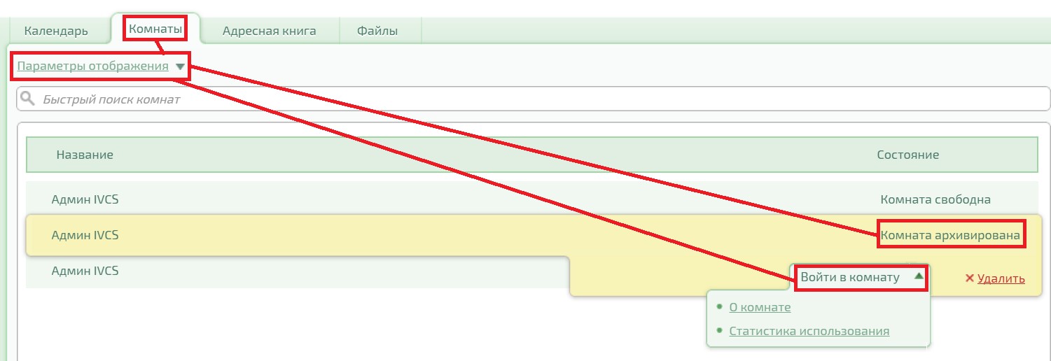 Чтобы выбрать полный/компактный просмотр ваших комнат или чтобы отобразить/скрыть архивированные комнаты нажмите на вкладку «Параметры отображения». При помощи контекстного меню модератор может просмотреть и изменить настройки комнаты, а также удалить активную и неактивную комнату. Приглашённый участник может удалить комнату только из своего списка.