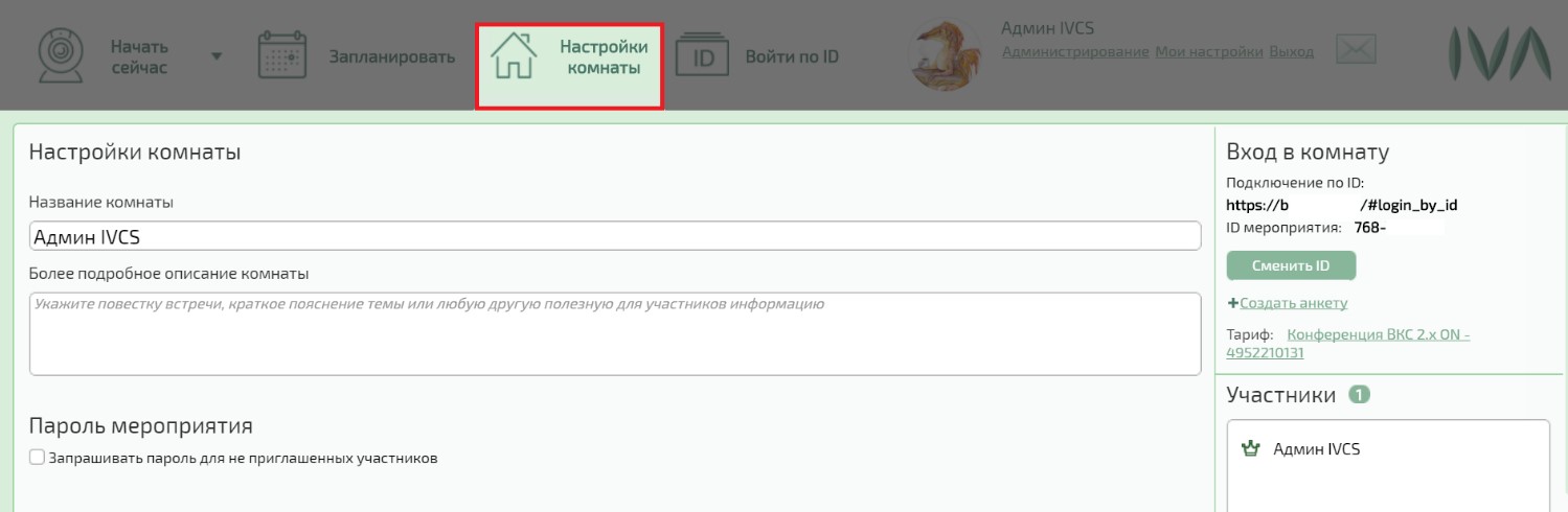• ­данные для подключения к комнате по ID: сайт для входа, ID мероприятия для подключения, пароль (его наличие зависит от настроек системы);