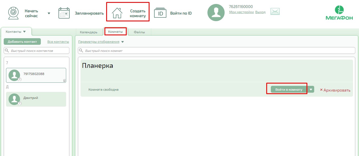 • ­«Комната свободна» — активная комната, в которой в данный момент нет участников. На карточке данной комнаты отображается надпись «Комната свободна»;