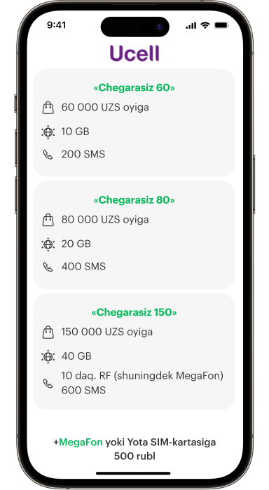 MegaFon yoki Yota ga ulanayotganingizda Ucell raqamingizni yoki Ucell shaxsiy kabinetingizni ko‘rsating va hisobingizga 500 bonus rubl oling