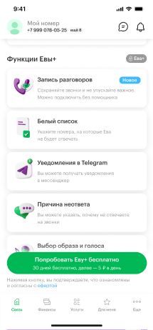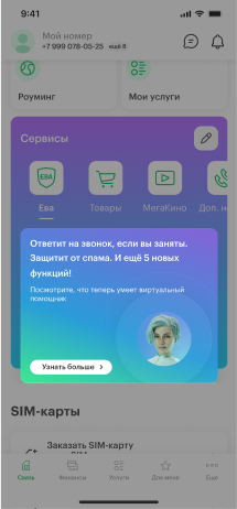 Еву или Еву+ можно подключить в Личном кабинете или приложении «МегаФон» в блоке сервисов в разделе «Связь». Виртуальный помощник доступен на любом тарифе.