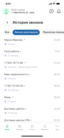 Их можно найти в Личном кабинете или в приложении «МегаФон» → Раздел «Связь» → Блок «Сервисы» → Ева → История звонков. Выберите из списка нужный звонок и нажмите на него, чтобы прочитать расшифровку и прослушать аудиозапись.